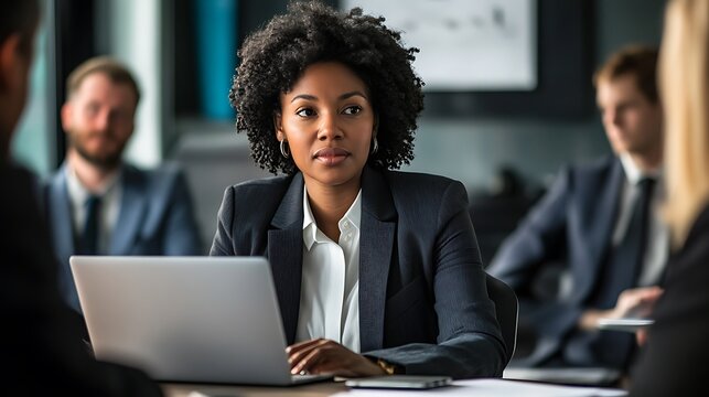 A businesswoman conducting a meeting with a laptop open and team members actively contributing