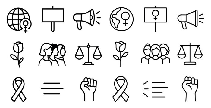 Feminism and gender equality icon set. Outline vector symbols of female power, solidarity, and protest. Includes raised fist, Venus symbol, girl power and diverse community icons.