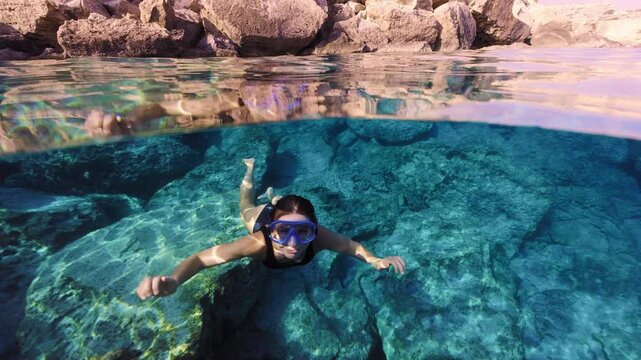 A girl in a swimsuit swims underwater in the ocean. Snorkeling and research of the bottom of the sea, recreation and tourism, active recreation at sea. High quality 4k footage