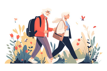 Senior man and woman walk on nature in park. Healthy lifestyle of pair family. An elderly person moves towards longevity and well-being. Vector cartoon illustration