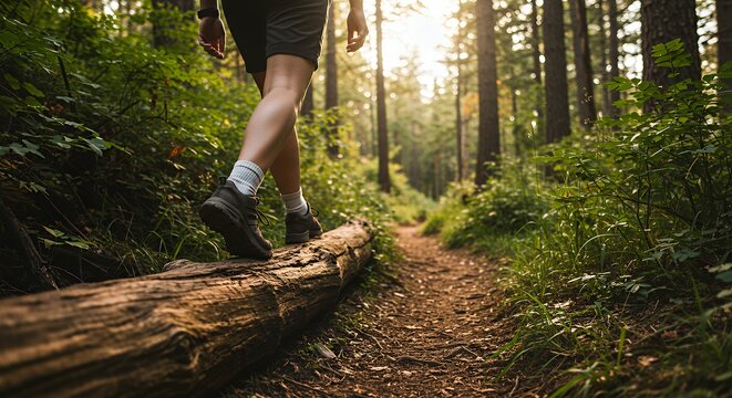 Hiking Through Forest Person Balancing on Log Along Nature Trail