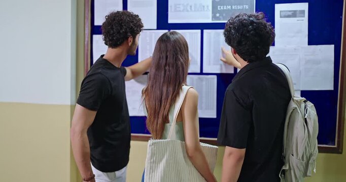 Indian young adult gen z busy pupil girl boy group look notice board check study exam result report campus back view of female male man team wear bag do read new paper list name data project date