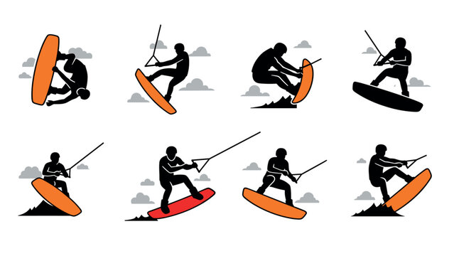 Silhouette wakeboarding actions: dynamic water sports moves in flat design