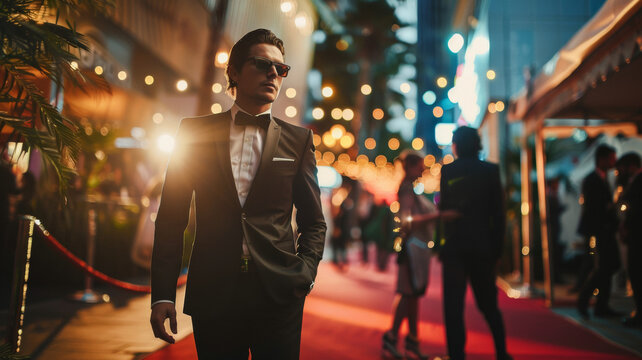 Dapper man in a tuxedo at a glamorous event, encapsulating red-carpet sophistication.