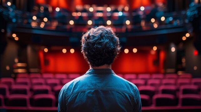 An actor stands on stage, rehearsing lines with focused intensity. The theater, filled with red seats, remains quiet, waiting for the performance to begin.