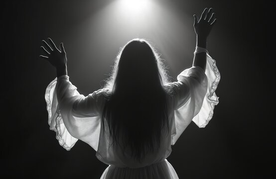 Backlit actress in spotlight. Female silhouette with hands raised, theatrical drama performance scene. Emotional art, expressive pose in theater. Inspiration, fantasy, religion, spirituality concept.