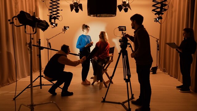 Studio for photo video production with lighting equipment and cyclorama, team members preparing lights and camera, stylist fixing model makeup before recording.