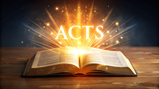 Book of Acts.  Open bible revealing the name of the book of the bible in a epic cinematic presentation. Ideal for slideshows, bible study, banners, landing pages, religious cults and more.