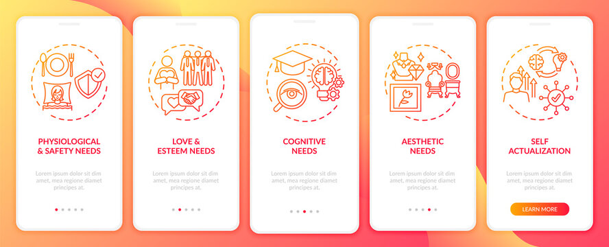 Human being needs red onboarding mobile app page screen with concepts. Self-actualization walkthrough 5 steps graphic instructions. UI, UX, GUI vector template with linear color illustrations