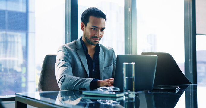 Laptop, corporate and business man typing finance report, investment portfolio and actuary reading email. Computer, internet and employee in office for risk assessment, project or research online