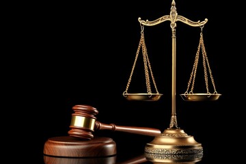 A golden scale of justice beside a wooden gavel, symbolizing fairness and legal balance with copy space. Warm glowing lighting. Elegant law office background.