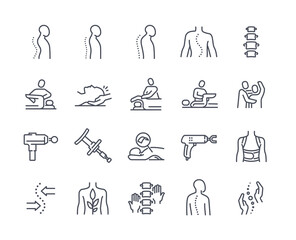 Chiropractic line icon set. Included the icons as Chiropractor, spline treatment,  massage, Osteopath, Osteopathy, joint recovery, and more.