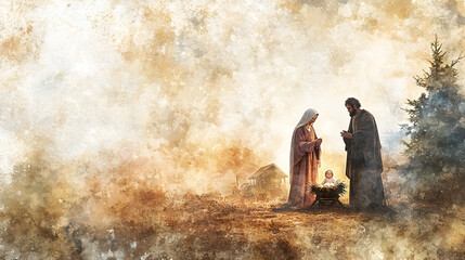 hermosa pintura en efecto acuarela de la sagrada familia del nacimiento del niño jesus del niño dios en la religion catolica noche buena y navidad pintura artistica con espacio de copia para navidad