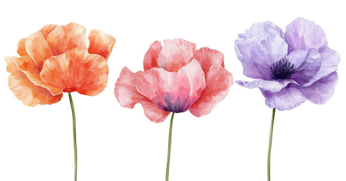 Acuarela representando tres flores amapolas de colores  morado, rosa y naranja, simétricas y  una junto a las otras, sobre fondo blanco