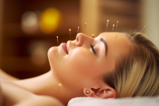 Beautiful Woman Received acupuncture treatment on face by  therapist, chinese medicine treatment, health and healing concept.