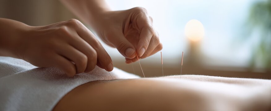 The acupuncture treatment showing sterile needles being gently inserted into a relaxed patient's back