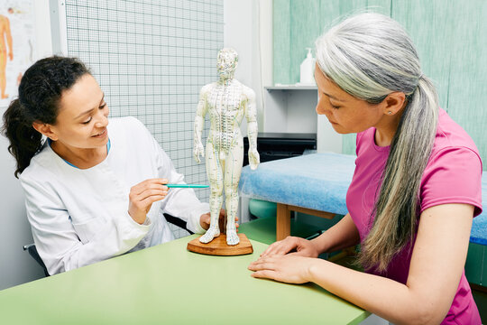 Female acupuncturist showing points on acupuncture model of human body to her patient at traditional Chinese medicine centre