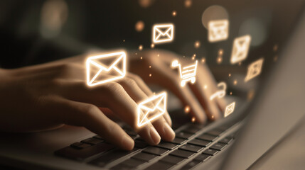 Digital Marketing and Online Advertising Strategy Concept. A person using laptop with advertising icons, performance metrics, audience targeting, and campaign strategy analytics for online marketing.