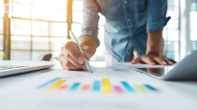 Creative, business people and team discussion with documents in meeting for brand or target audience. Group, campaign manager and planning with chart for ads, performance data or strategy in startup