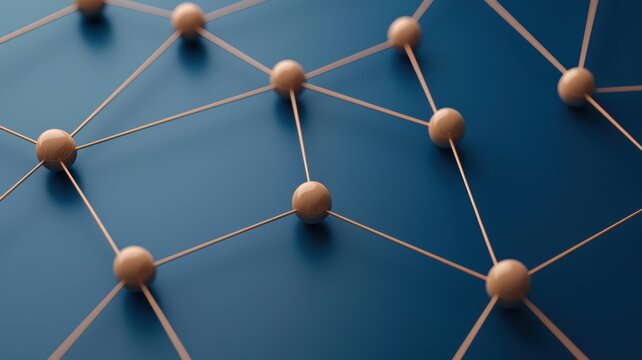 Abstract network structure with interconnected wooden spheres and strings on blue background, representing connection, technology, and communication.