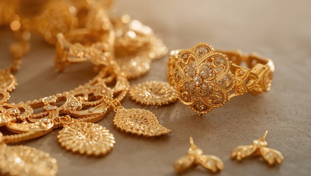 Detailed close-up of intricate gold jewelry, showcasing craftsmanship and cultural significance