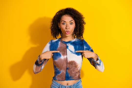 Surprised young woman points at herself against a bold yellow background wearing stylish tie-dye top