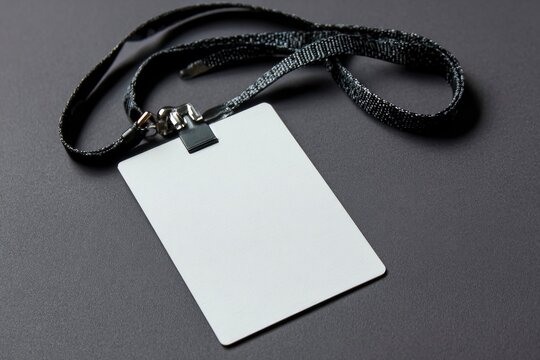 A closeup shows a blank white identification card attached to a patterned black lanyard resting on a gray surface