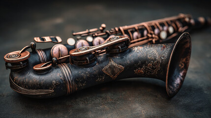 A close-up shot of a vintage saxophone with intricate details. The saxophone has a copper finish