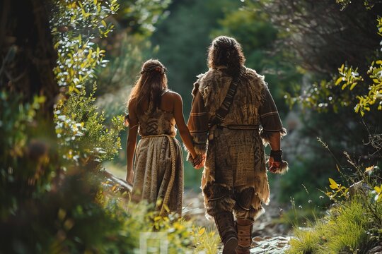 Biblical scene of Adam and Eve in Eden, watercolor illustration. Generative AI.