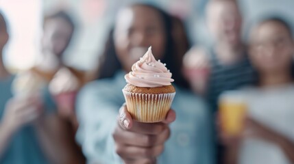Celebrating Together: Virtual Birthday Party with Friends Holding Cupcakes and Drinks on Video Call, Adapting to Modern Celebrations