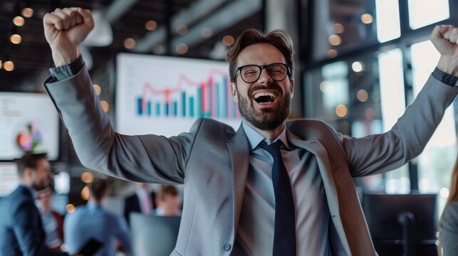 Confident businessperson celebrates success  a journey from stress to triumph in a modern office