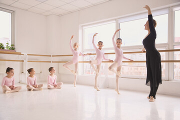 Young ballet students practicing basic positions at barre in dance studio. Concept of dance studio ads, classical ballet promo materials, children training marketing, and arts education branding.
