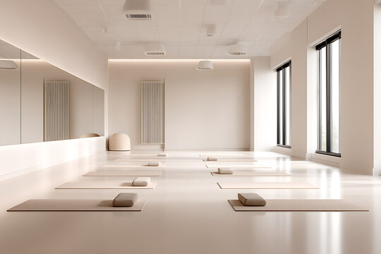 adaptive sports facility, a serene space for adaptive sports training with mirrored mats and equipment in soothing neutral colors enhancing a peaceful ambiance
