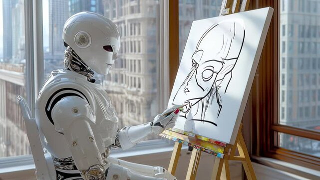 Mechanical creativity transforms artistic process. Android sketches portrait with algorithmic precision. Static composition.