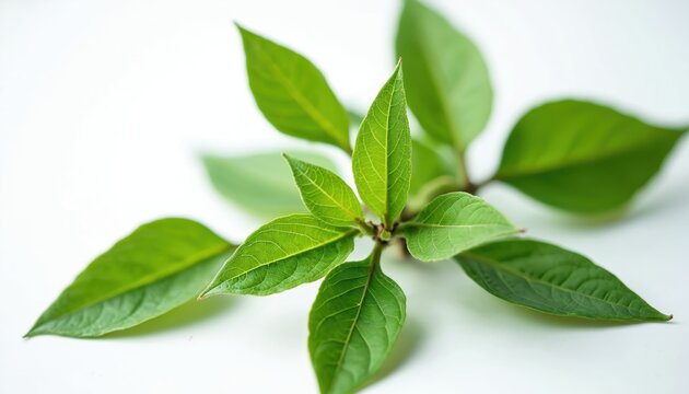 Green ashwagandha plant twig isolated on white background. Close-up fresh leaves. Herbal medicine adaptogen plant ingredient for tea, healthy food supplement. Alternative medicine concept.