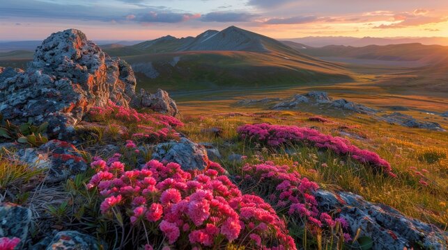 A serene landscape of the Siberian mountains, with Rhodiola rosea plants blooming on the rugged slopes, the scene bathed in the golden glow of the sunset