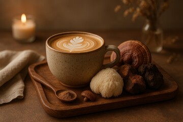 Mushroom latte in ceramic cup with lions mane, reishi, chaga on wooden plate. Adaptogenic coffee, functional beverage