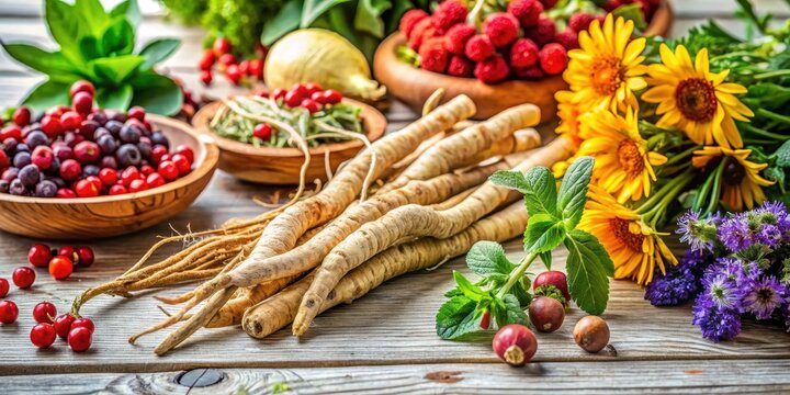 A vibrant display of fresh adaptogenic herbs like ginseng and licorice root on a light-colored wooden table, with colorful flowers and fruits in the background , Colorful Fruits, Wooden Table