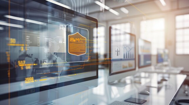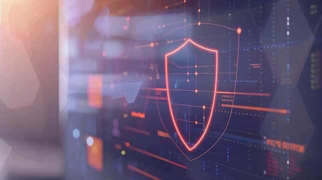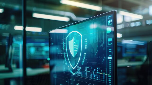 Close-up of a digital screen with a pop-up ad blocked by a shield icon, symbolizing ad-free browsing and online privacy protection in a modern workspace setting.