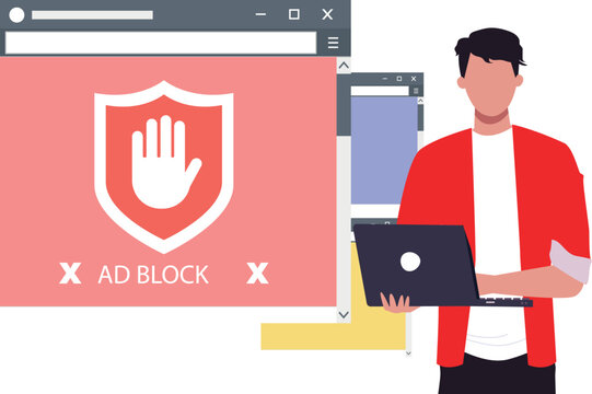 Ad blocking, blocking unwanted advertising popup windows, dialog box with internet security software, ad block stickman with red stop sign, isometric design, yellow background.