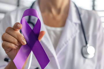 Female doctor in white uniform hold purple violet ribbon awareness in hand for ADD,ADHD,Alzheimer's Disease ,Arnold Chiari Malformation,Childhood Hemiplegia & stroke,Pancreatic cancer,Sarcoidosis
