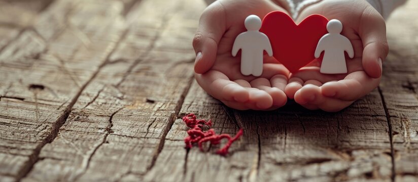 Red heart in hands dad and child Valentine s day Mother s Day Love and health care Family insurance. Copy space image. Place for adding text