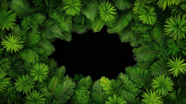 Tropical Leaf Frame: Lush green tropical leaves form a vibrant, circular frame, creating a natural border with a dramatic black center, perfect for adding text or images.