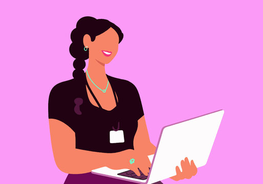 Woman with dark hair using a laptop against a pink background, wearing a name tag. Illustration