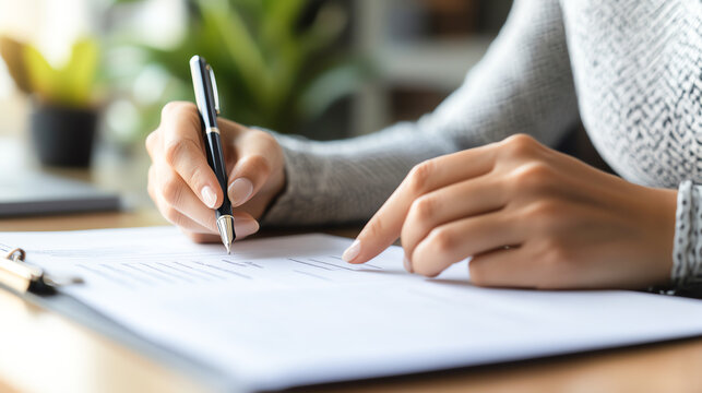 Person signing an insurance policy document at a desk, pen in hand, insurance paperwork, contract signing