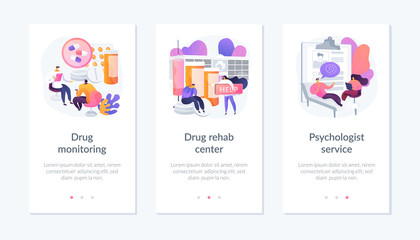 Addiction treatment, narcotic addict medication, recovery and rehabilitation. Drug monitoring, drug rehab center, psychologist service metaphors. Mobile app UI interface wireframe template.