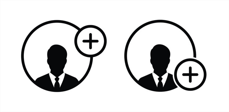 user icon with a plus sign, add friend icon. new user icon. add new member icon with plus symbol in outline and solid styles, representing adding a new user or sign-up functionality