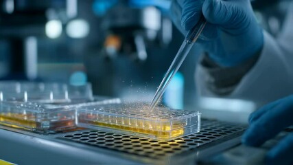 Lab technician wearing sterile clothing and blue gloves analyzing samples using pipette on petri dish, with microscope and additional dishes in background