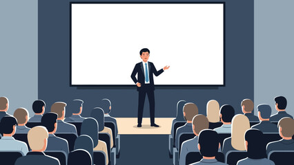 Engaging business presentation illustration featuring a professional speaker addressing an attentive audience in a modern conference hall. Perfect for corporate training and educational events