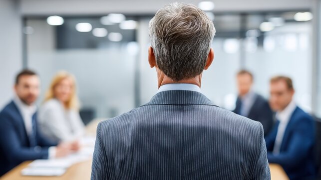 Mature businessman standing, viewed from behind, addressing colleagues in a modern meeting room setting.